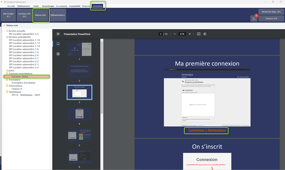 Dans l’onglet Assistance > Release Note, un document est mis à disposition pour vous guider dans la procédure de connexion à l’extranet propriétaire.