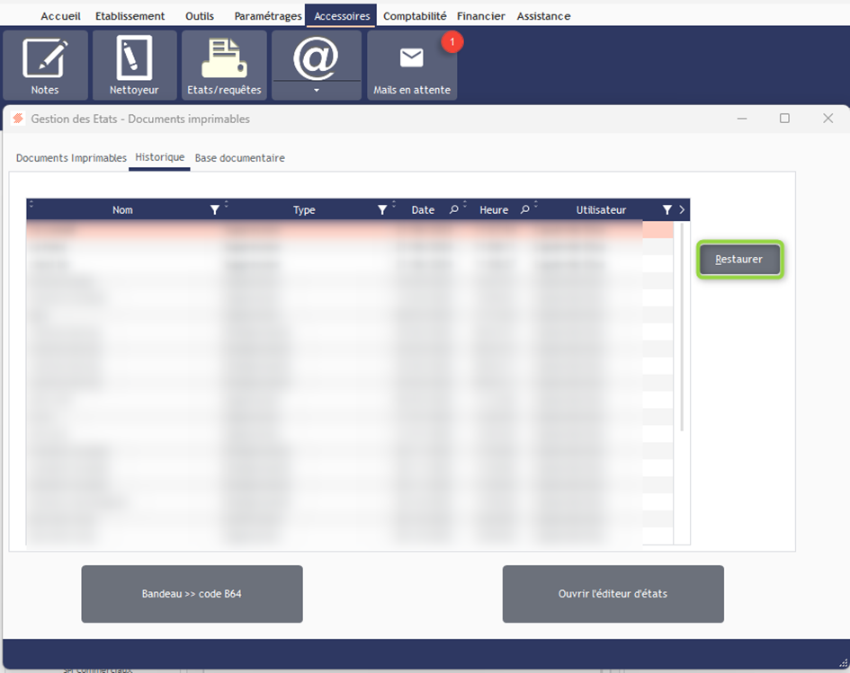 Sélectionnez le document souhaité, et cliquer sur « restaurer » :