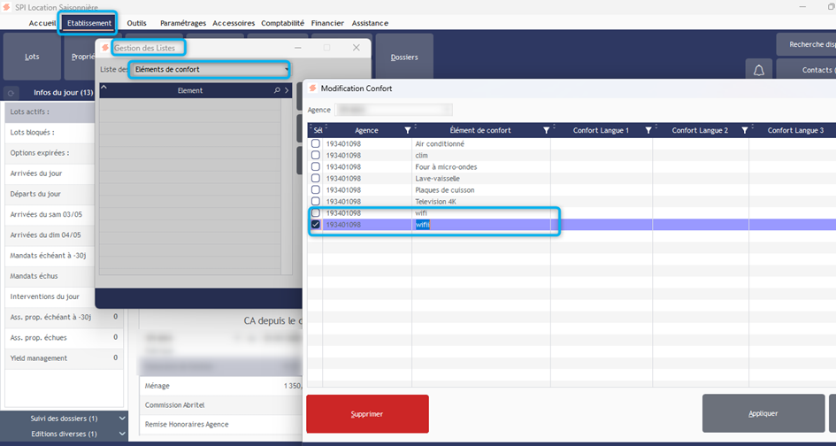 Si vous avez des doublons dans les éléments de confort, vous pouvez les supprimer sans qu'ils disparaissent de la fiche du lot. Par exemple, il y a deux fois l'élément "Wifi", mais écrit différemment. Si vous cliquez deux fois sur l'élément "wifii", vous pouvez le modifier. Si vous le modifiez exactement comme l'autre, c'est-à-dire "wifi", le doublon disparaîtra sans être supprimé de la fiche du lot.