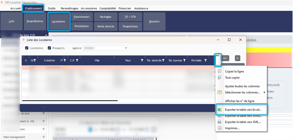 Sur la flèche tout à droite, exporter sur Excel. Vous n’avez pas besoin de sélectionner les locataires, l’extraction en Excel est de toute la grille.