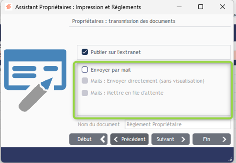 Lors de la saisie du règlement propriétaire, vous avez désormais 3 choix pour l’envoi du mail.