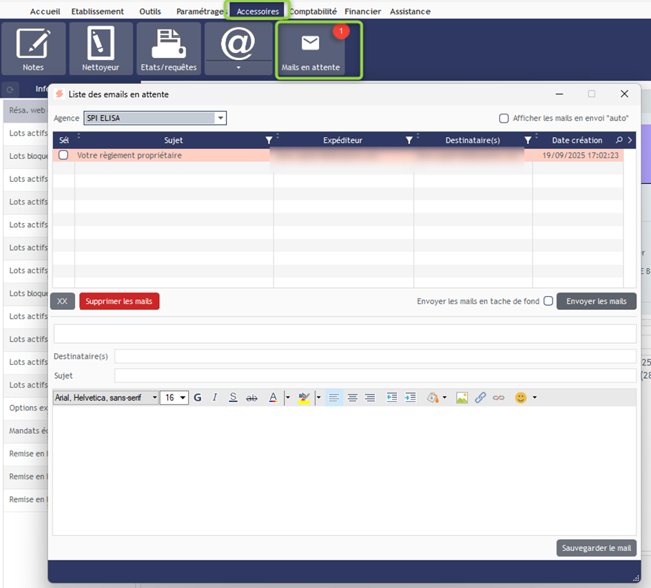 Si vous cochez « envoyer par mail » + « mails : mettre en file d’attente », alors le mail viendra se mettre dans Accessoires / Mails en attente :