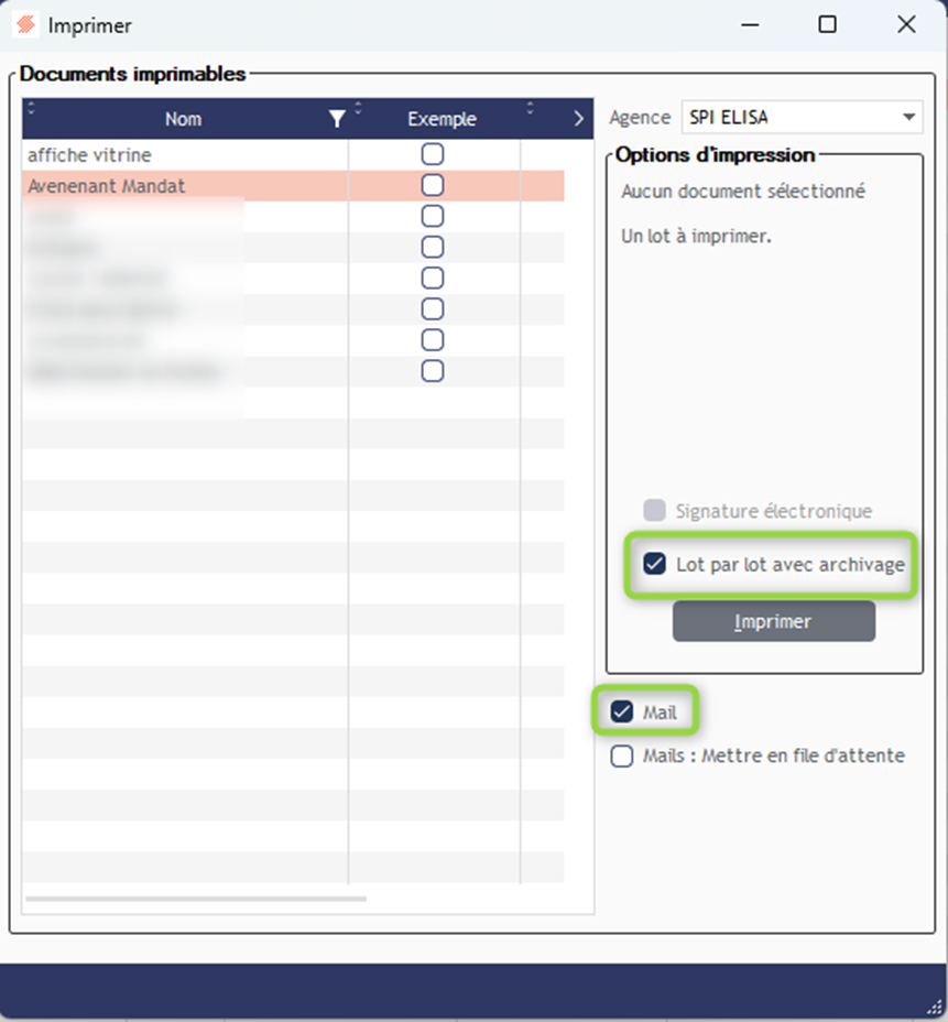Avant de cliquer sur imprimer il vous faut vous assurer que la case « lot par lot avec archivage » soit bien cochée pour que l’adresse mail apparaisse dans la fenêtre :