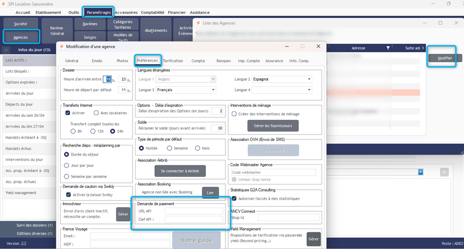 Sur l’onglet paramétrages, agence, cliquez sur modifier puis sur l’onglet préférences. Ici vous devez renseigner un URL API et une Clef API, c’est votre webmaster qui va vous donner cette information.
