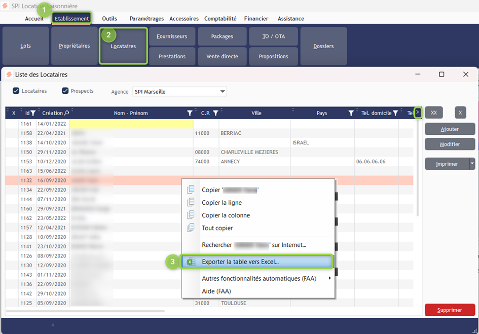 - Clic droit dans la liste des locataires : « Exporter la table vers Excel»