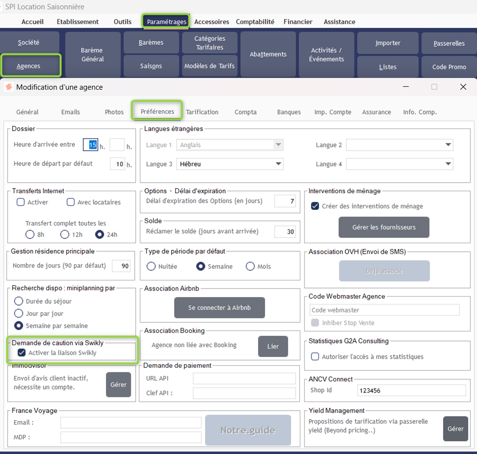 La liaison doit être activée depuis le module « Paramétrages » : Agences : Onglet « Préférences » : cocher la case « Activer la liaison Swikly »