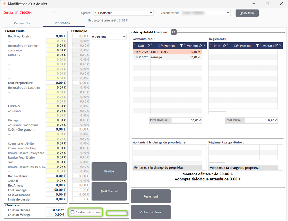 Un témoin pour enregistrer le fait que la caution a été sécurisée par le locataire est disponible dans la partie « Tarification » d’un dossier.