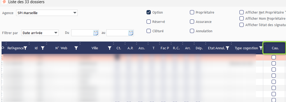 Une nouvelle colonne intitulée « Cau. » est disponible dans la liste des dossiers, elle présente la valeur de la case à cocher « Caution sécurisée » de chaque dossier. Cette colonne vous permet de visualiser rapidement les dossiers pour lesquels vous pouvez relancer le locataire pour la sécurisation de la caution.