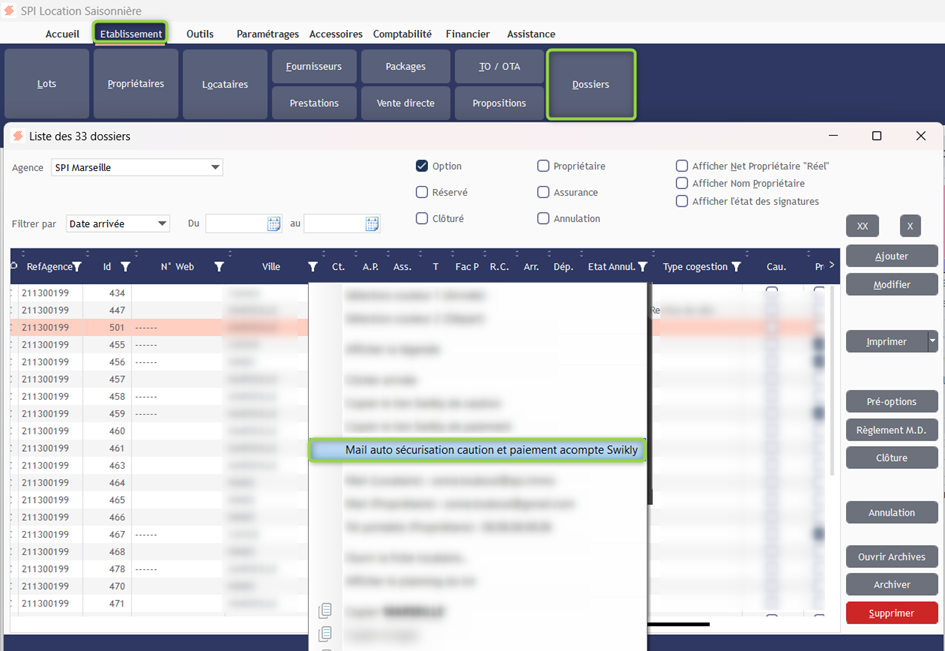 Vous avez la possibilité de relancer le locataire si celui-ci n’a toujours pas sécurisé la caution à l’aide d’un clic droit depuis la liste des dossiers : « mail auto. Sécurisation caution… »