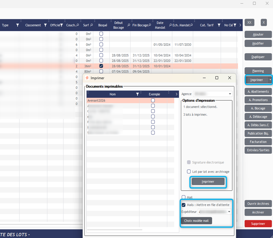 - Choisissez l’expéditeur et le modèle de mail à utiliser, puis cliquez à nouveau sur Imprimer.