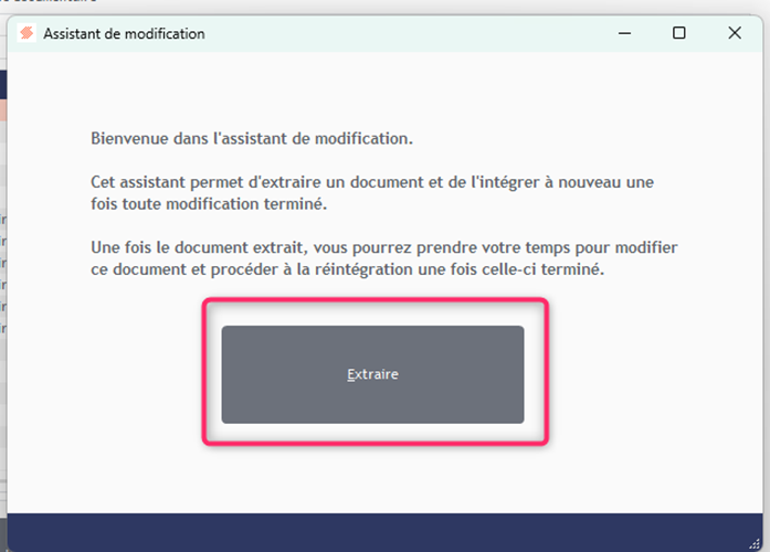 Sélectionnez le document que vous souhaitez modifier, puis cliquez sur Extraire pour en obtenir une copie modifiable. L’assistant de modification va s’ouvrir, vous pouvez encore cliquer sur extraire.