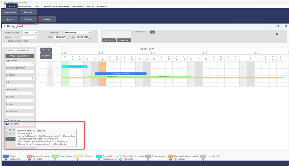 Pour consulter le planning général, rendez-vous dans l’onglet Accueil > Planning. Vous y trouverez l’ensemble des lots ainsi que les réservations associées.