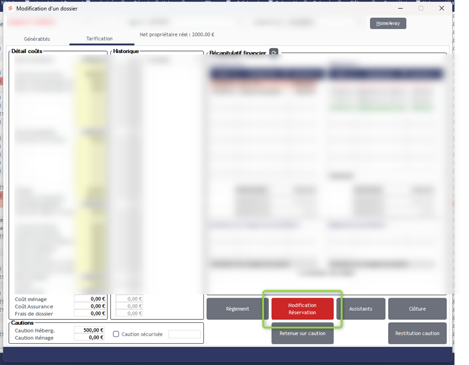 - Depuis l’onglet Tarification, cliquez sur le bouton Modification réservation.